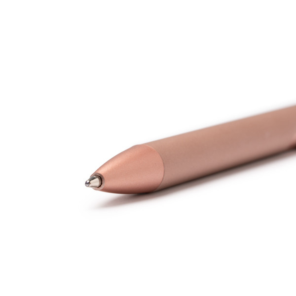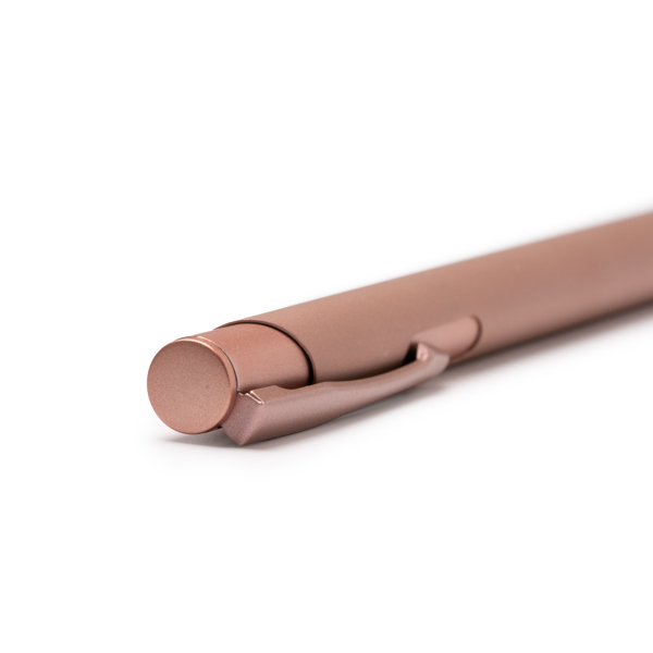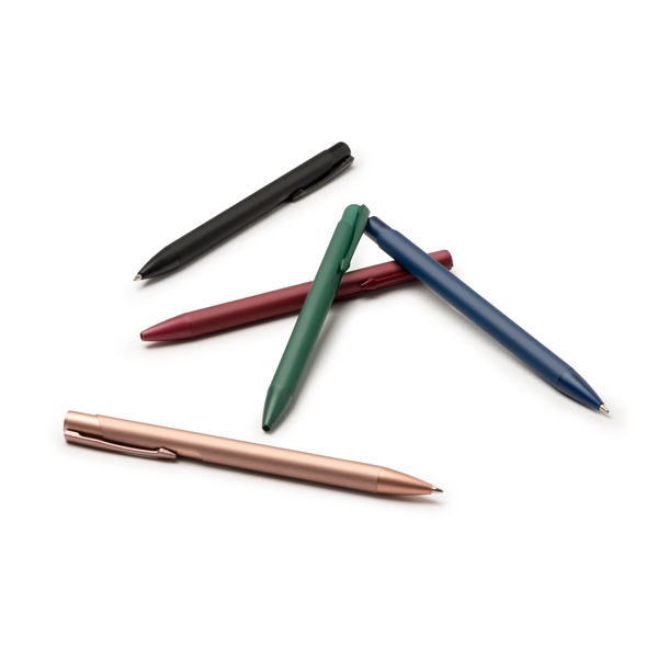 Possui um corpo metálico com botão de pressão e acabamento mate, oferecendo um design elegante e duradouro. Equipada com uma recarga de tinta azul jumbo, é ideal para escrever confortavelmente sem interrupções prolongadas.