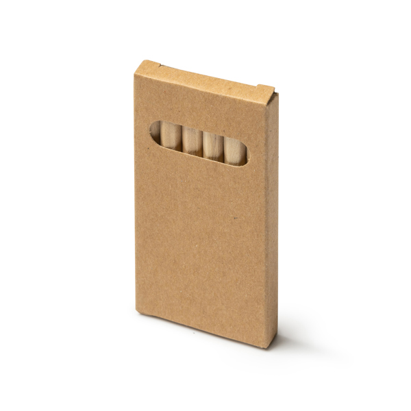 Conjunto de 6 lápis de cor em madeira em caixa de papelão reciclado.